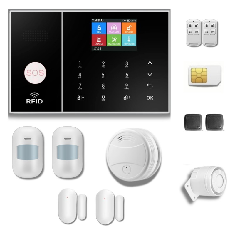 Opciones de activación Armado total / Desarmado / Armado modo hogar / Pánico SOS. Tiempo de retardo configurable de entrada y salida para el armado y desarmado mediante teclado y mando a distancia.